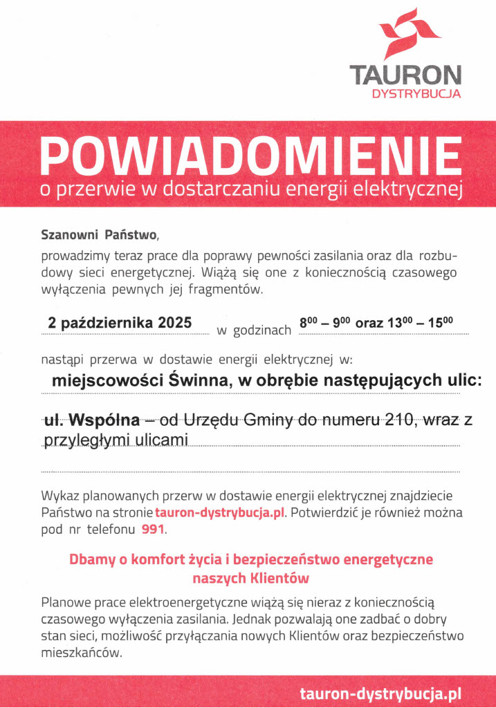 Powiadomienie o planowej przerwie w dostarczaniu energii elektrycznej w Świnnej